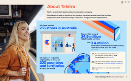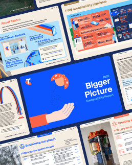 Telstra Sustainability reporting suite features a condensed layout, detailed charts, maps and infographics as well as other supporting documents including In focus factsheets and Data Pack. Since 2019 we have partnered closely with Telstra’s Sustainability team to create communications materials for Sustainability and Modern Slavery.